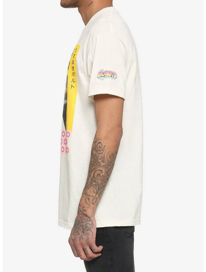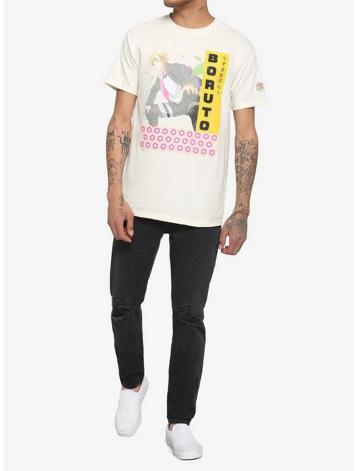 Get ready for the next generation of shinobi with this tee! From Boruto: Naruto Next Generations, this tee soft tee features a faded print of a determined-looking Boruto, with rows of hexagonal shapes in spired by his jacket underneath him, and his name in a bold panel down the side.