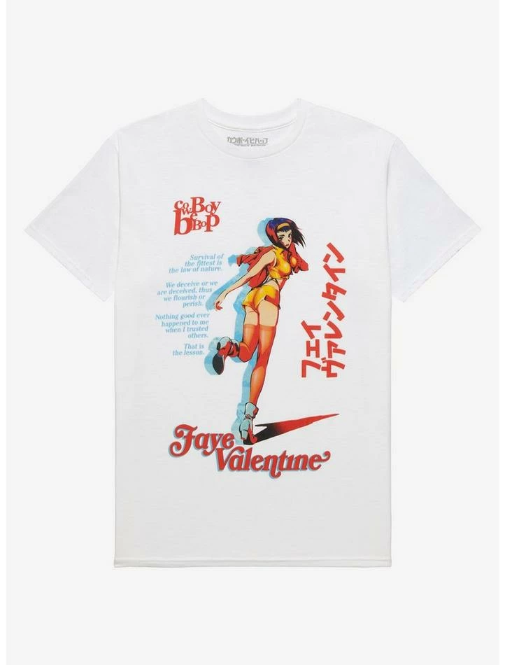 ย If we’re being cryogenically frozen in suspended animation for 54 years, we would want to be in this tee! Step aboard the Bebop with this tee of Faye Valentine! She’s depicted in a vintage style with her famous quotes printed on one side and her name in Japanese on the other, with “Cowboy Bebop”ย up top.