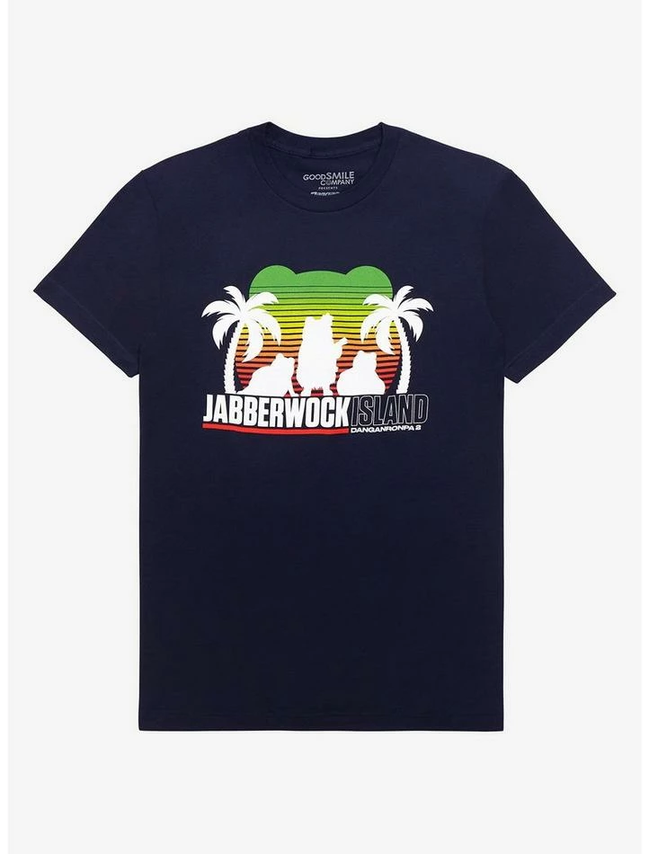 Kick back and relax on Jabberwock Island with this Danganronpa 2 tee, featuring a sunset and silhouettes of residents and palm trees.