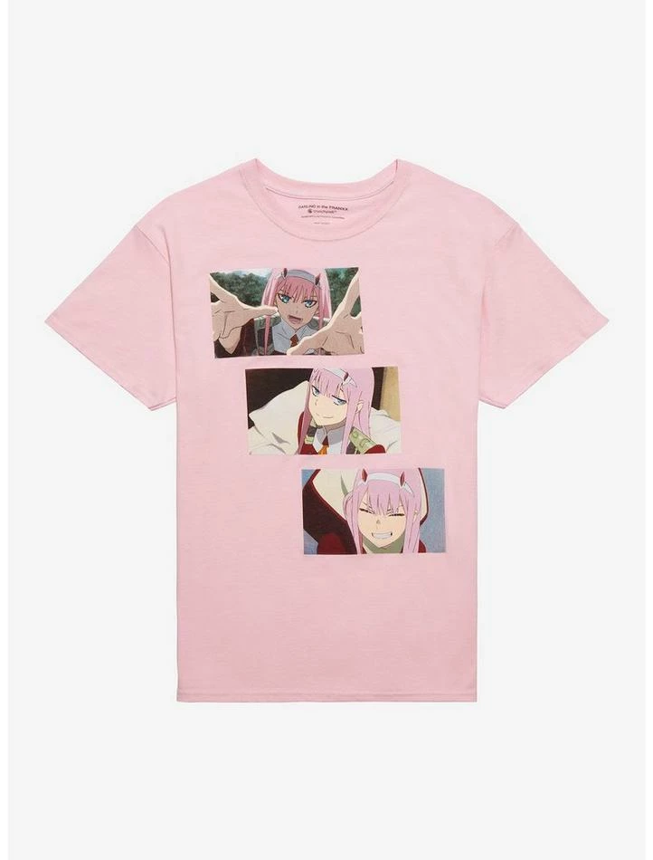 Are you her Darling? Get dressed to pilot the Strelizia with the perfect tee! From Darling in the Franxx, this pink top features three panels of Zero Two, and the anime title down the center on the back.