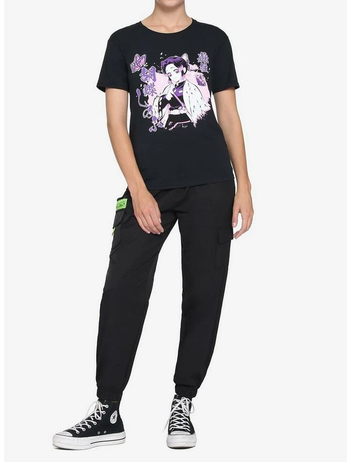 Love Shinobu? Rep your favorite Insect Hashira with this tee! Features a print of Shinobu from Demon Slayer: Kimetsu no Yaiba front and center in purple and pink, with Japanese text and butterflies surrounding her.