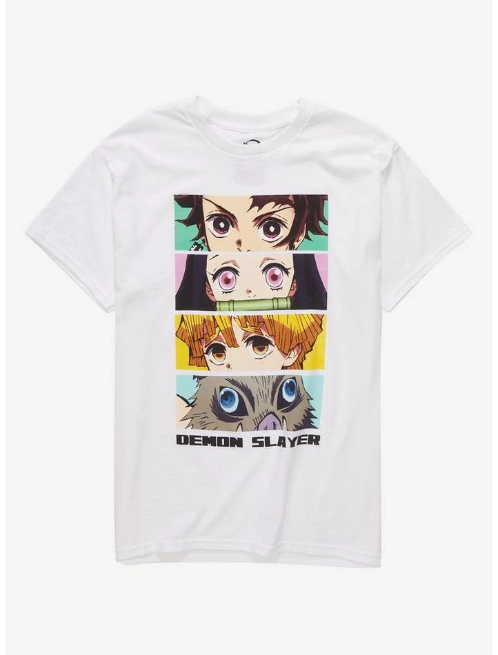 Can’t get enough ofย Demon Slayer: Kimetsu no Yaiba?ย We see that, and so do these four! This stacked long-sleeve features Tanjiro, Nezuko, Zenitsu and Inosuke’s eyes, with “Demon Slayer” printed on the bottom.ย