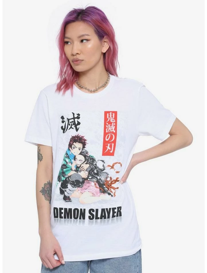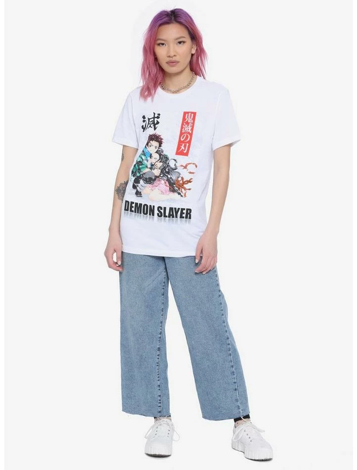 Trying to save your sister and slay the demon who turned her? You’ll need this Demon Slayer tee! Printed with Tanjiro and Nezuko in the snow just after she was turned, with the show’s name in English below and Japanese above.