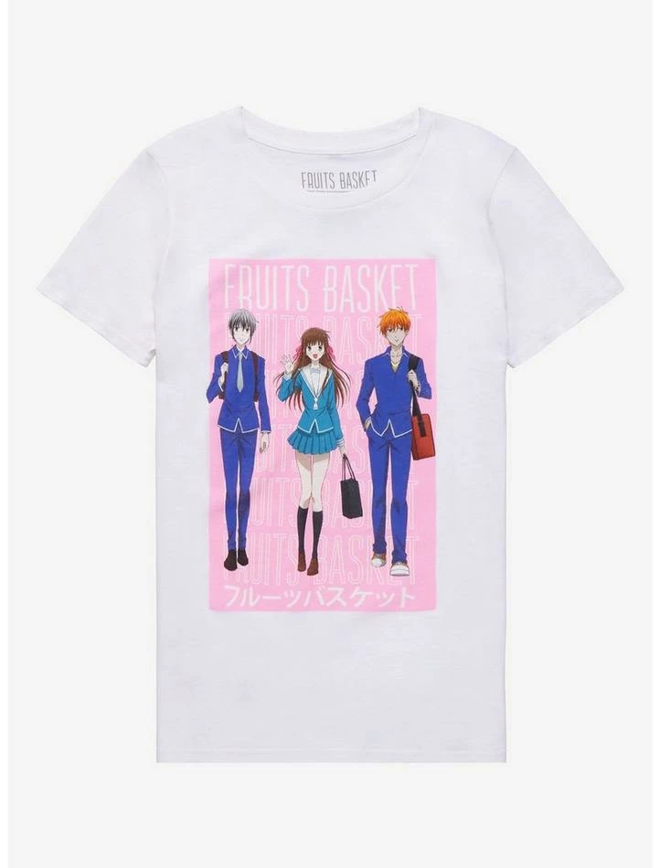 Head back to school with Yuki, Tohru and Kyo in style! Rep your favorite anime with this Fruits BasketΒ tee, featuring the trio in their school uniform and a repeated background of the anime title.