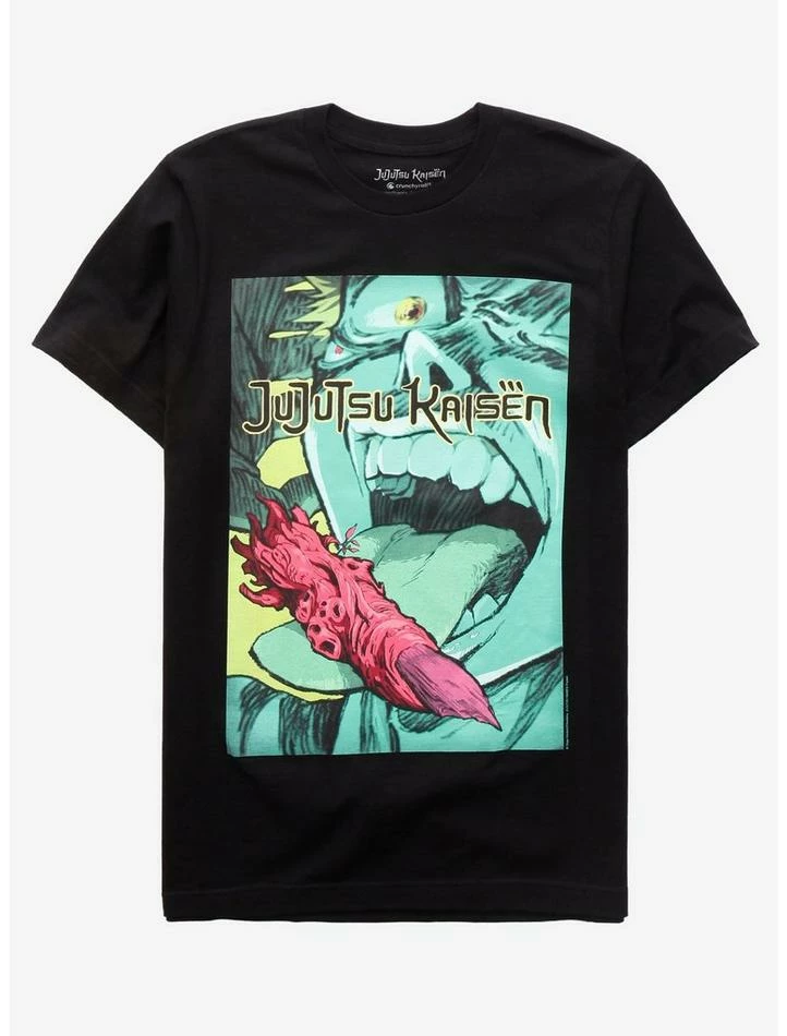 ย Oh no… Itadori is ready to eat Sukuna’s finger. This black tee from Jujutsu Kaisen features a green image of Itadori with the finger in red.ย