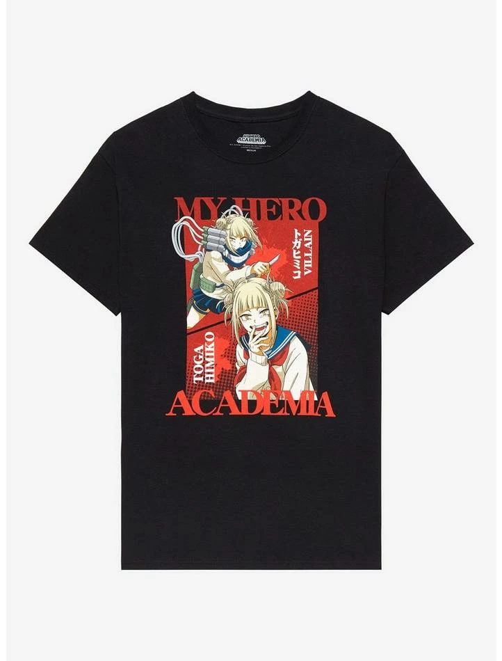 Will you let her be your friend? Rep your favorite baddie from the League of Villains with this My Hero AcademiaΒ tee! This bloody red design features Himiko Toga in her school girl outfit and her villainous costume, with her name and the anime’s title in bold letters.