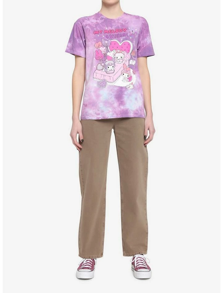 Kuromi can set her rivalry aside for a stellar slumber party. This black tee features a supercute pastel image of Kuromi and My Melody sharing secrets at a sleepover!