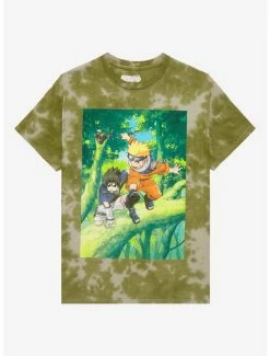 Blend in with the trees during your shinobi training! Stay cool and rep Team 7 with this forest green tie-dye tee, featuring a central print of young Naruto and Sasuke training in the trees, with Kakashi watching in the background.