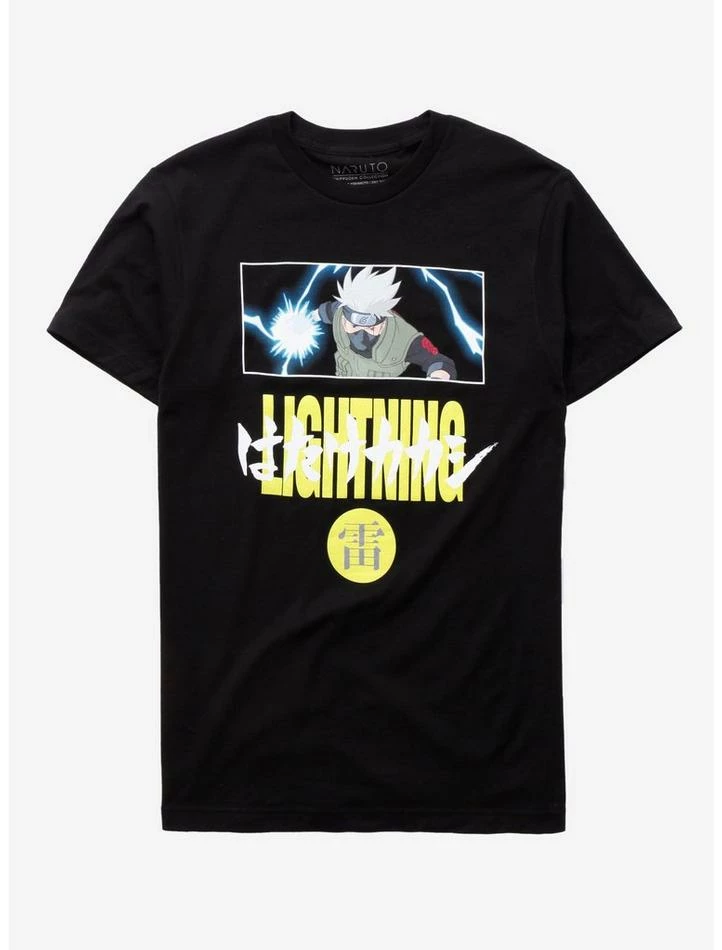 This black tee features an image of Kakashi with the natural element he can manipulate: lightning. Underneath there is Japanese text and “Lightning.”ย ย