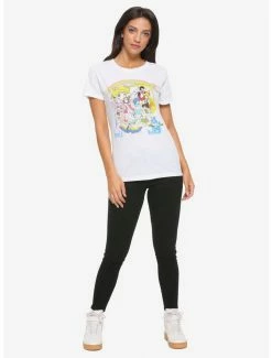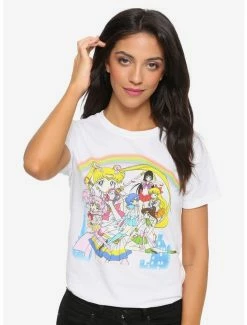This white tee fromΒ Sailor MoonΒ features your favorite Inner Guardians with Sailor Moon and Sailor Chibi Moon, with the skyline and a rainbow behind.