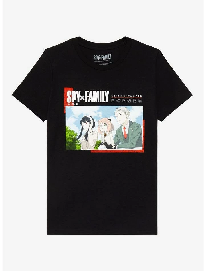Anya, Loid and Yor Forger are the perfect family…for espionage. This tee shows a still from the anime of the family, along with the Spy x Family logo and the names of the characters.