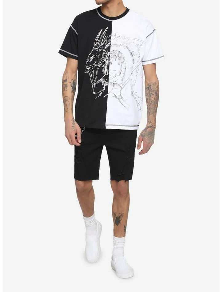 Spirited Away but make it streetwear-inspired. This split black and white tee features contrast stitching and a gorgeous sketch print of Haku and Chihiro from the Studio Ghibli classic, Spirted Away.