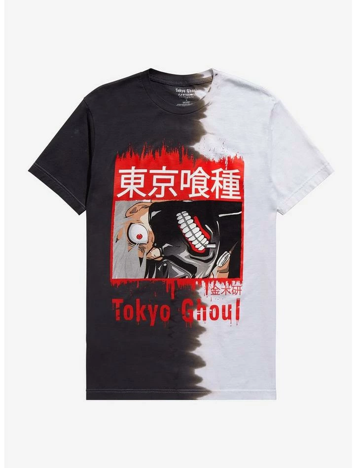 We’ve got another ghoulish tee to add to your anime collection! This one from Tokyo Ghoul features a spilt black and white wash design, with a graphic of Ken Kaneki wearing his mask. It’s framed by a dripping blood design and the anime’s title in English and Japanese.