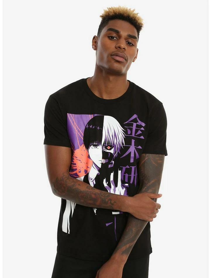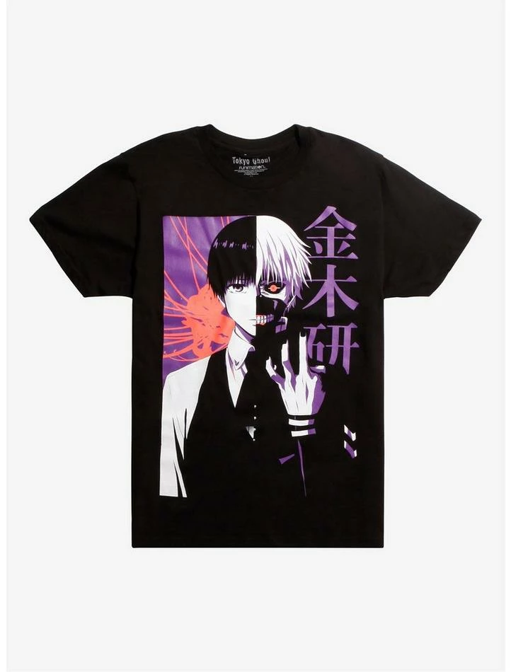 Black T-shirt from the dark and twisted horror world of Tokyo Ghoul featuring a large updated Ken Kaneki split face character design on front.
